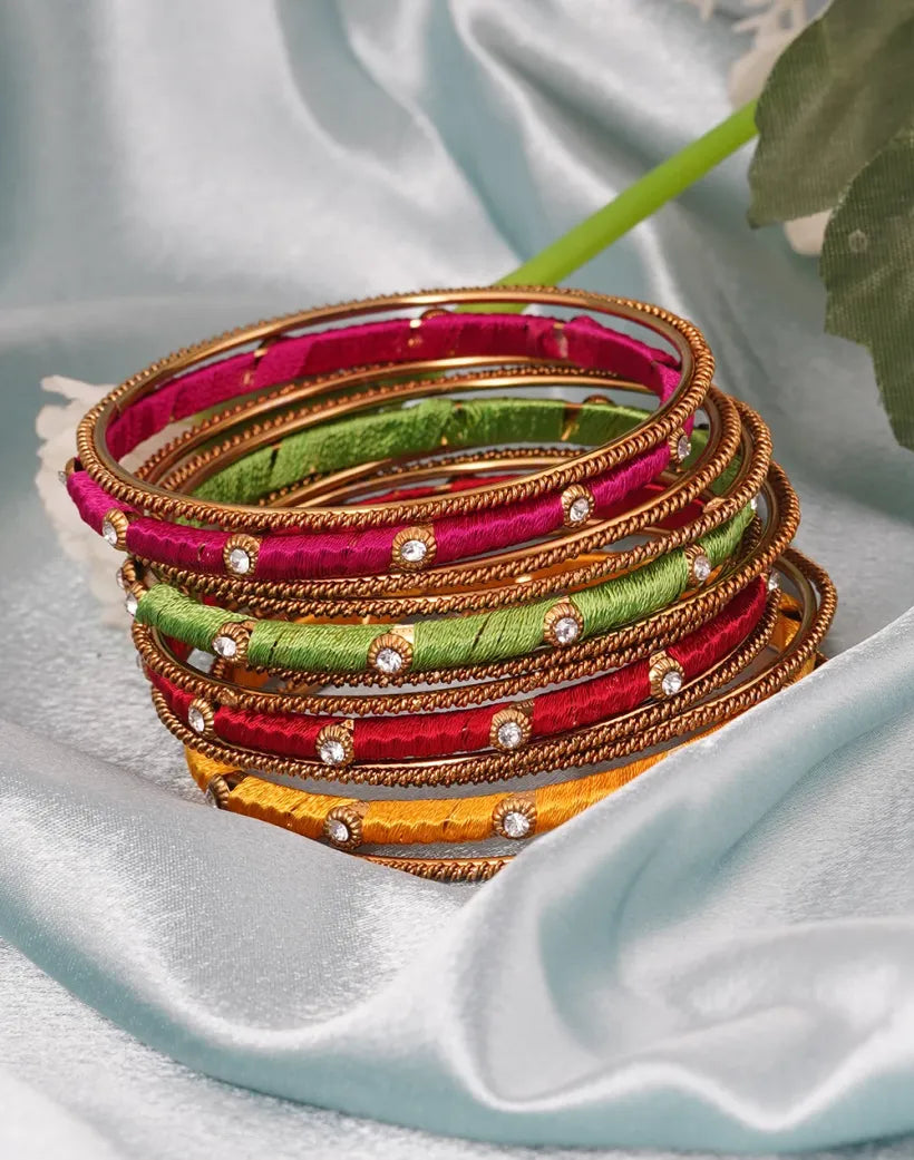 Set Of 12 Multicolour Stones Gold Plated Silk Thread Bangles