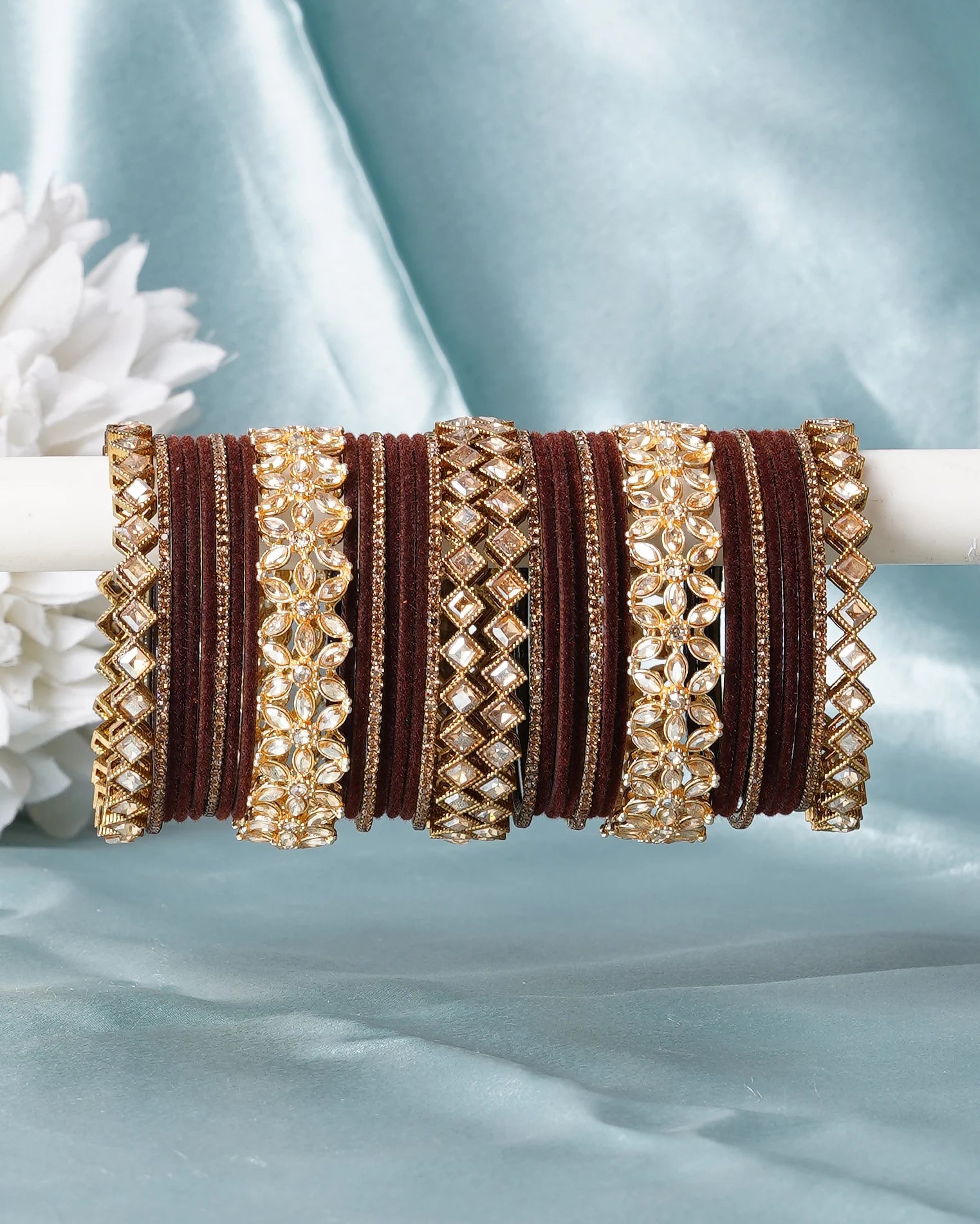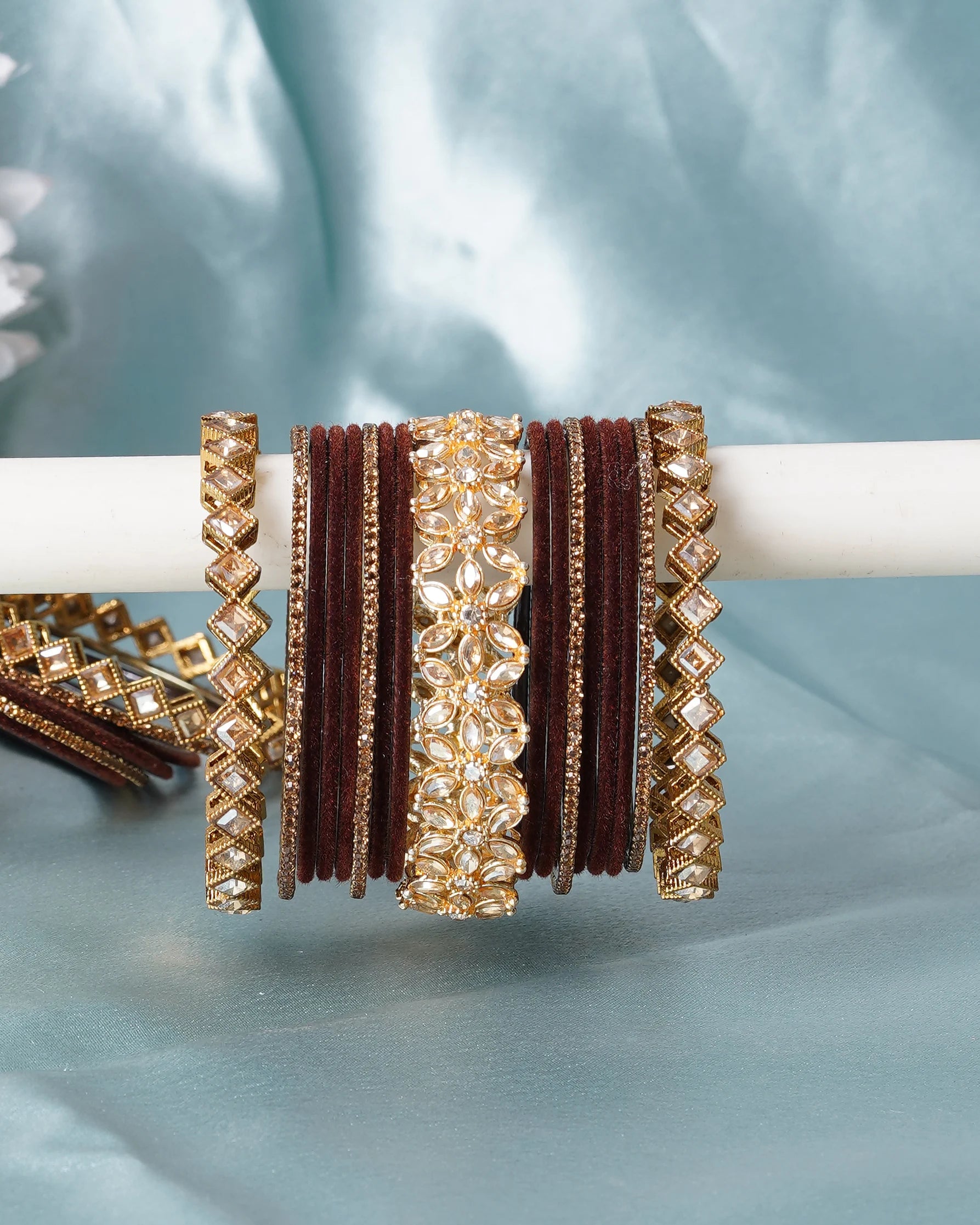 Each bangle is carefully crafted with smooth velvet wrapping, intricate stone-studded detailing, and high-quality Kundan work for a flawless finish. Ideal for weddings, sangeet, engagement ceremonies, or festive occasions, this set complements lehengas, sarees, and traditional attire effortlessly.