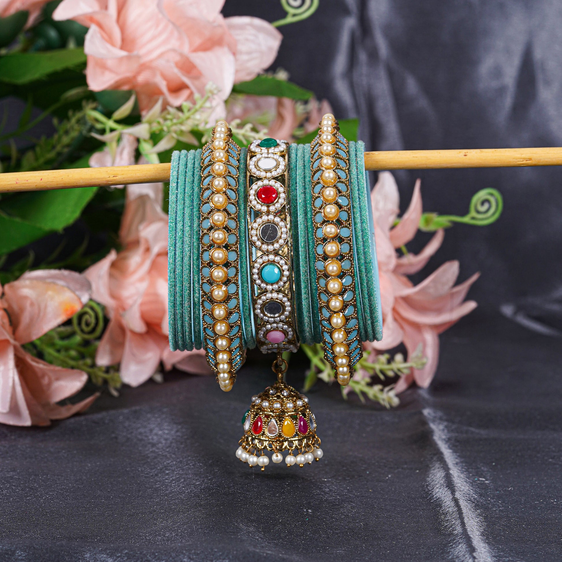 The vibrant turquoise shade symbolizes elegance and freshness, while the intricate kundan detailing adds traditional richness and sparkle. Delicate pearl accents enhance the overall charm, making this designer bangle set ideal for weddings, festive occasions, and special celebrations.